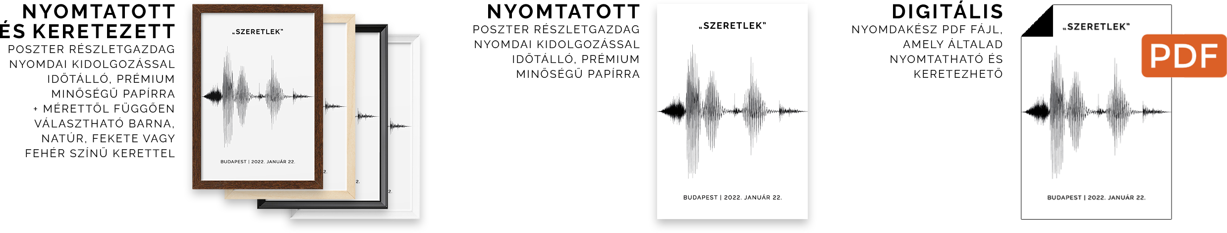 - Formátum: a megálmodott grafikát lehetőséged van nyomtatott és keretezett; nyomtatott (poszter) vagy digitális (általad nyomtatható és keretezhető) formátumban is megrendelni. A nyomtatott és keretezett képeknél mérettől függően fekete, fehér és tölgy színű fakeretek közül tudsz választani. A kisebb méretű képkeretek (13x18 és 21x30 vm) kitámasztóval is rendelkeznek.