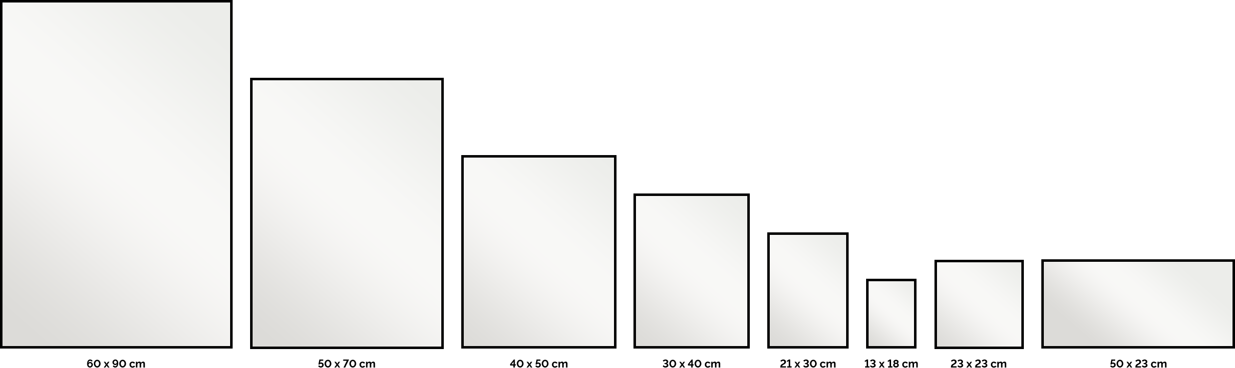 - Méret: a tájolástól függően a nyomtatott és keretezett formátumú grafikáinkat 13x18, 50x23, 21x30, 30x40, 40x50, 50x70, valamint 60x90 centiméteres méretben tudod megrendelni. A nyomtatott (poszter) és digitális (általad nyomtatható) formátumú változatok pedig 10x15, 13x18, 23x23, 21x30, 32x32, 30x40, 40x50, 50x70, valamint 60x90 centiméteres méretben érhetőek el alapértelmezetten, de egyedi igények szerint is meg tudjuk tervezni a kiválasztott képet.